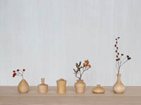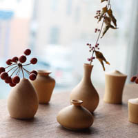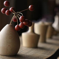 ちひさきはないれ 野草を摘んで飾るための小さな一輪差し。 日本に古くから伝わる形をそのまま小さく、 手のひらサイズにしました。 小さいからといって妥協することなく、裏面に至る まで細部にこだわって。 白く、くせのない木目が生けた草花をより一層引き 立てます。